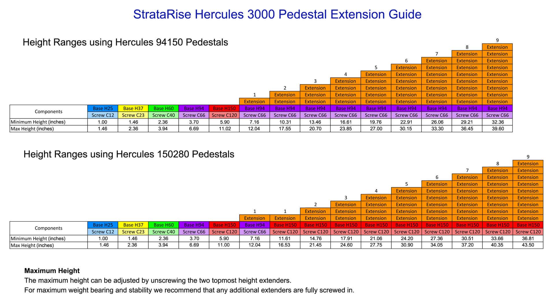 StrataRise Hercules pedestals are tested to withstand a maximum 6,600lbf (3,000 Kgf). At their weakest setting, i.e. maximum height adjustment with just one thread engaged, they will support at least 3,300 lbf (1,500Kgf).