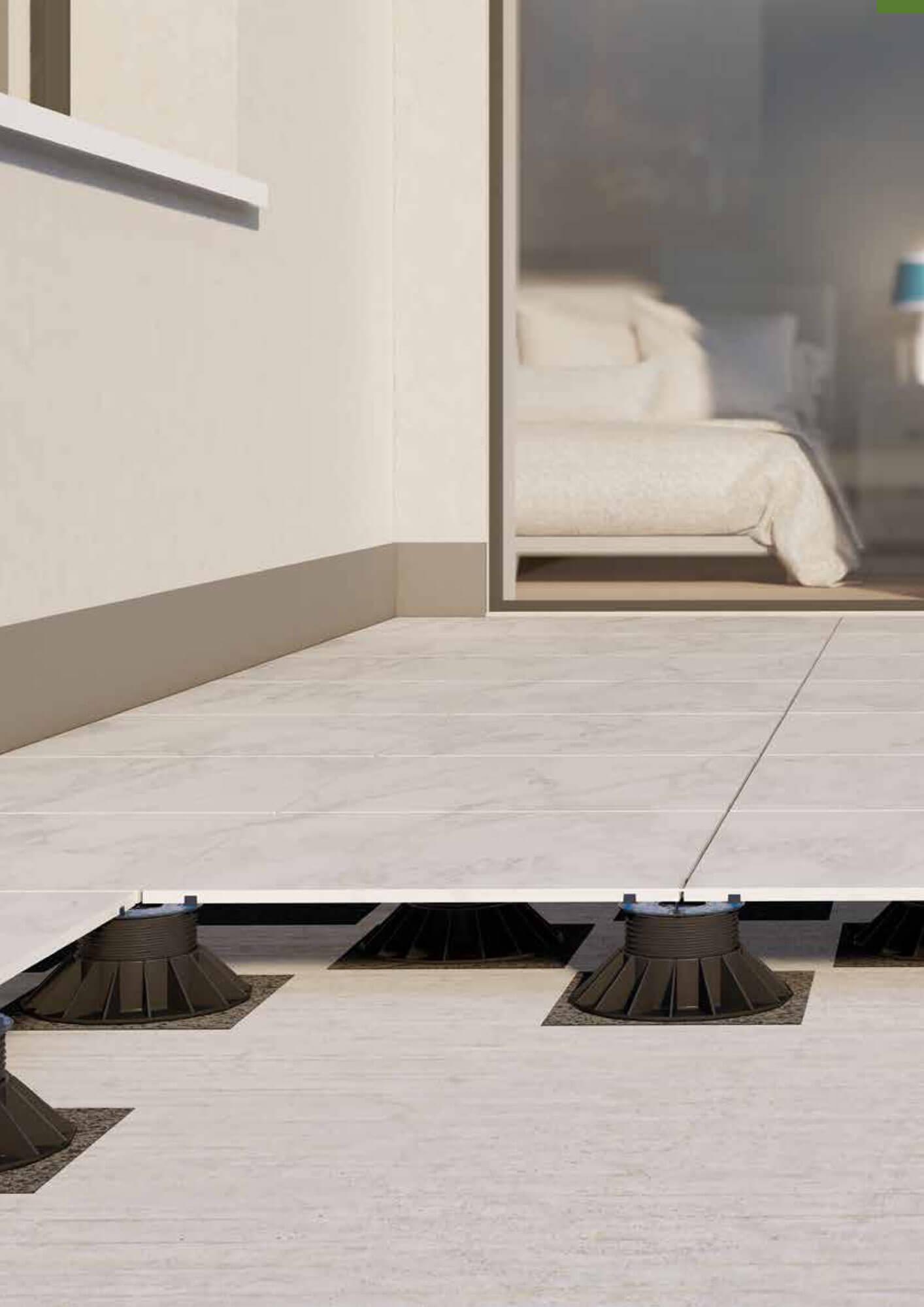 The pedestals are adjustable either from below or, for pavers, from above using the special adjustment tool.